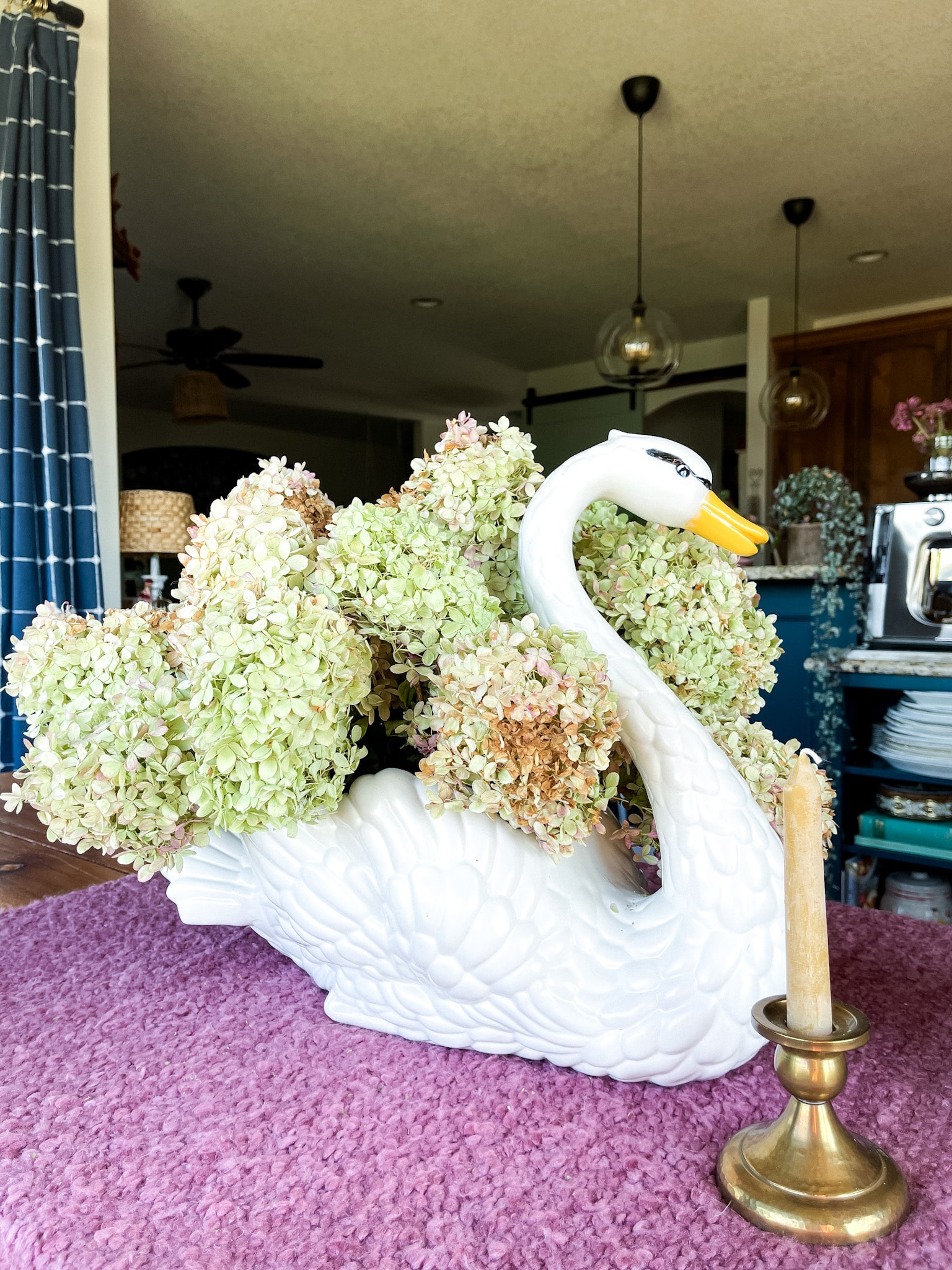 Until my big plan comes to fruition, I put a few of the blooms in this large ceramic swan I scored at an ESTATE SALE. I think from the moment I brought this lovely piece home, I knew some hydrangea would end up in it. I'm so in love with this look, especially because it's substantial, yet still simple. Soon enough, I'll be changing this design out for the holidays...I better enjoy it to its fullest while I can.