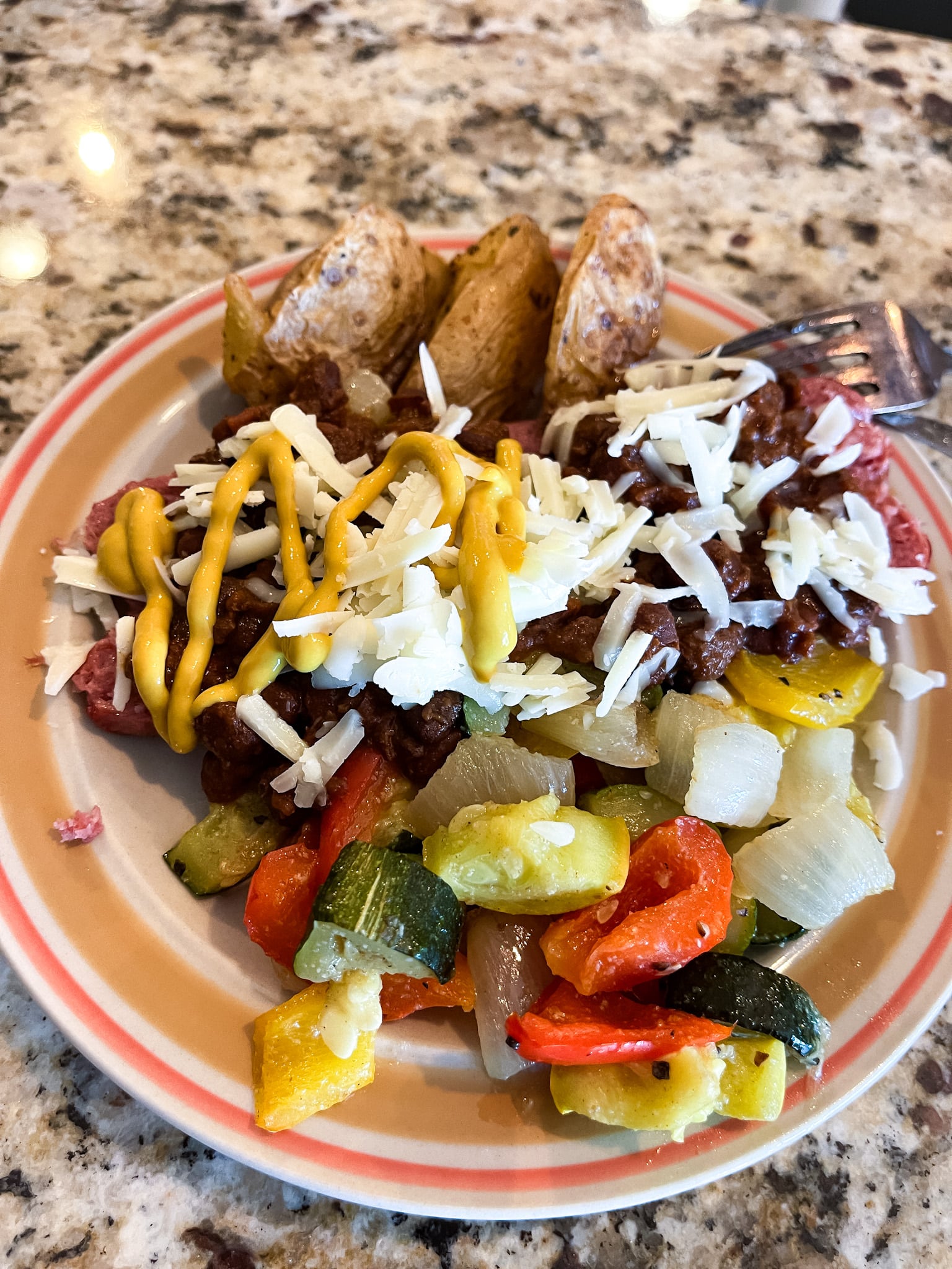 If you've followed along with me for any amount of time, you know that I have been on a health journey for the last four years. It's looked different throughout, but at the moment, is mostly low carb and as much clean food as I can get. I have a hankering for some "junk food" every now and then, though. The other night was one of them, so we made chili dogs. I didn't have a bun with mine, but it was still amazingly delicious...definitely hit the spot. I used a nitrate free polish hot dog from Costco, homemade chili, a sprinkle of raw milk cheddar, and some yellow mustard to top it all off. I'm still thinking about this meal and, thankfully, we have some leftovers to recreate!